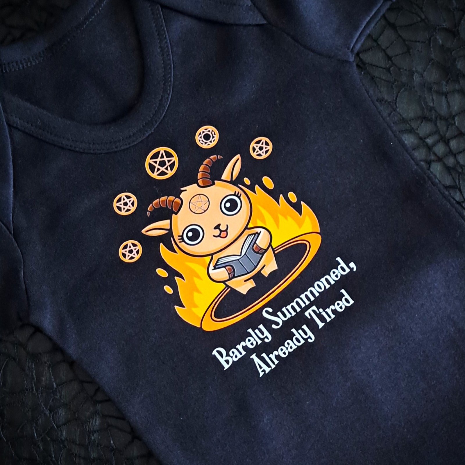 This gothic baby vest features an adorable demon goat surrounded by occult symbols and flames, paired with the slogan “Barely Summoned, Already Tired.” It’s the perfect mix of cute and dark humour for little mischief-makers.