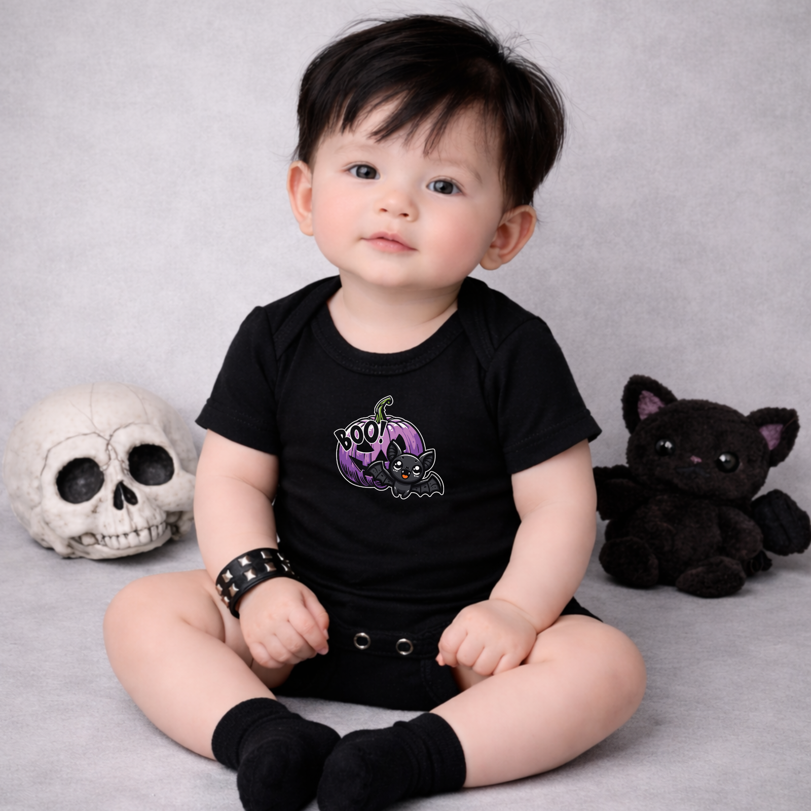 This adorable gothic baby vest features a playful bat flying from a purple pumpkin with the word “Boo.” A perfect mix of cute and spooky for little monsters in the making.
