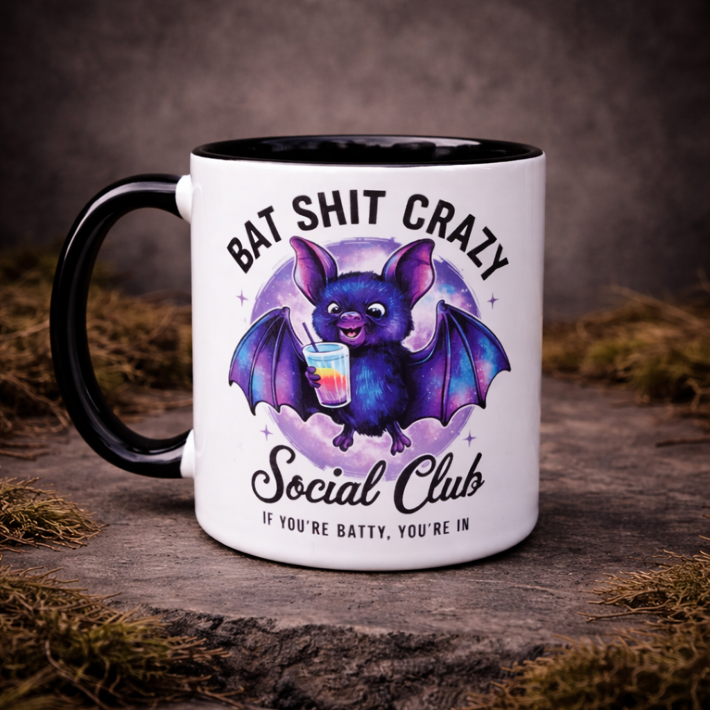 This cute bat mug features a colourful, cheeky bat proudly repping the “Bat Shit Crazy Social Club”. It’s playful, a bit chaotic, and way more fun than your standard boring coffee cup.