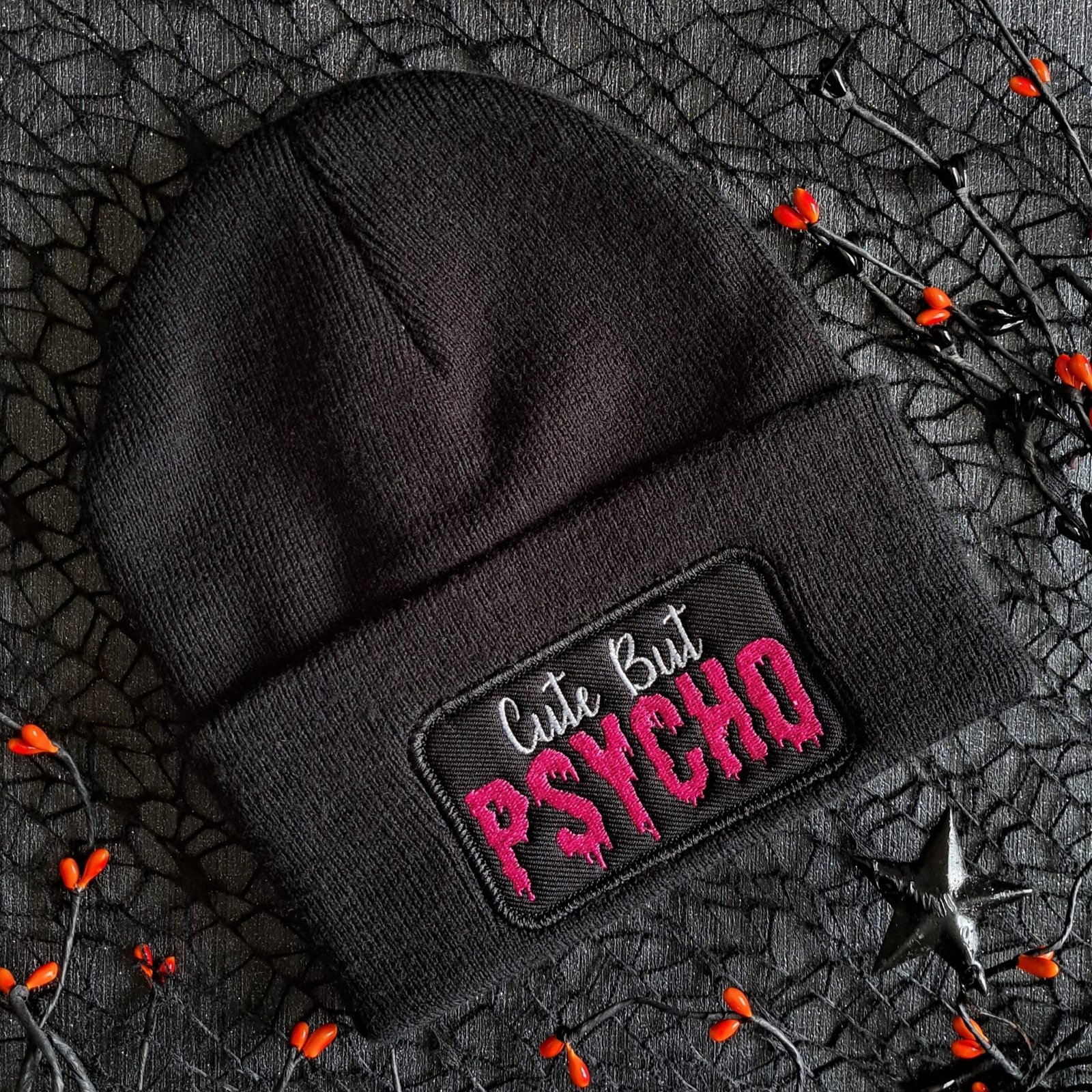 A black embroidered Cute But Psycho beanie with bold pink gothic lettering. Soft, warm and unapologetically alternative.