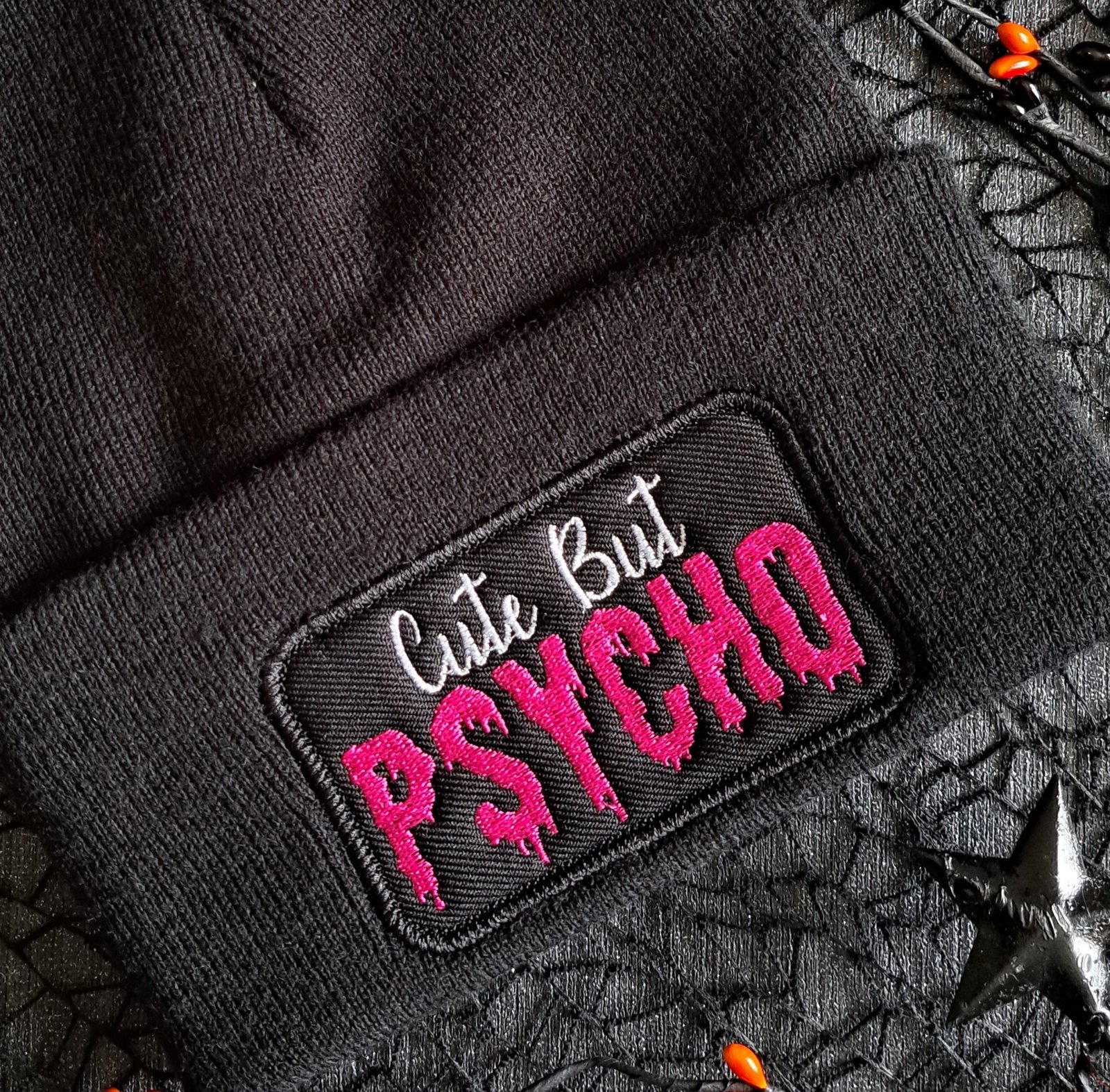 This black Cute But Psycho beanie features bold gothic embroidery stitched directly into the knit — no patches, no peeling, no shortcuts. Just clean, high-quality threadwork in striking white and vivid pink.