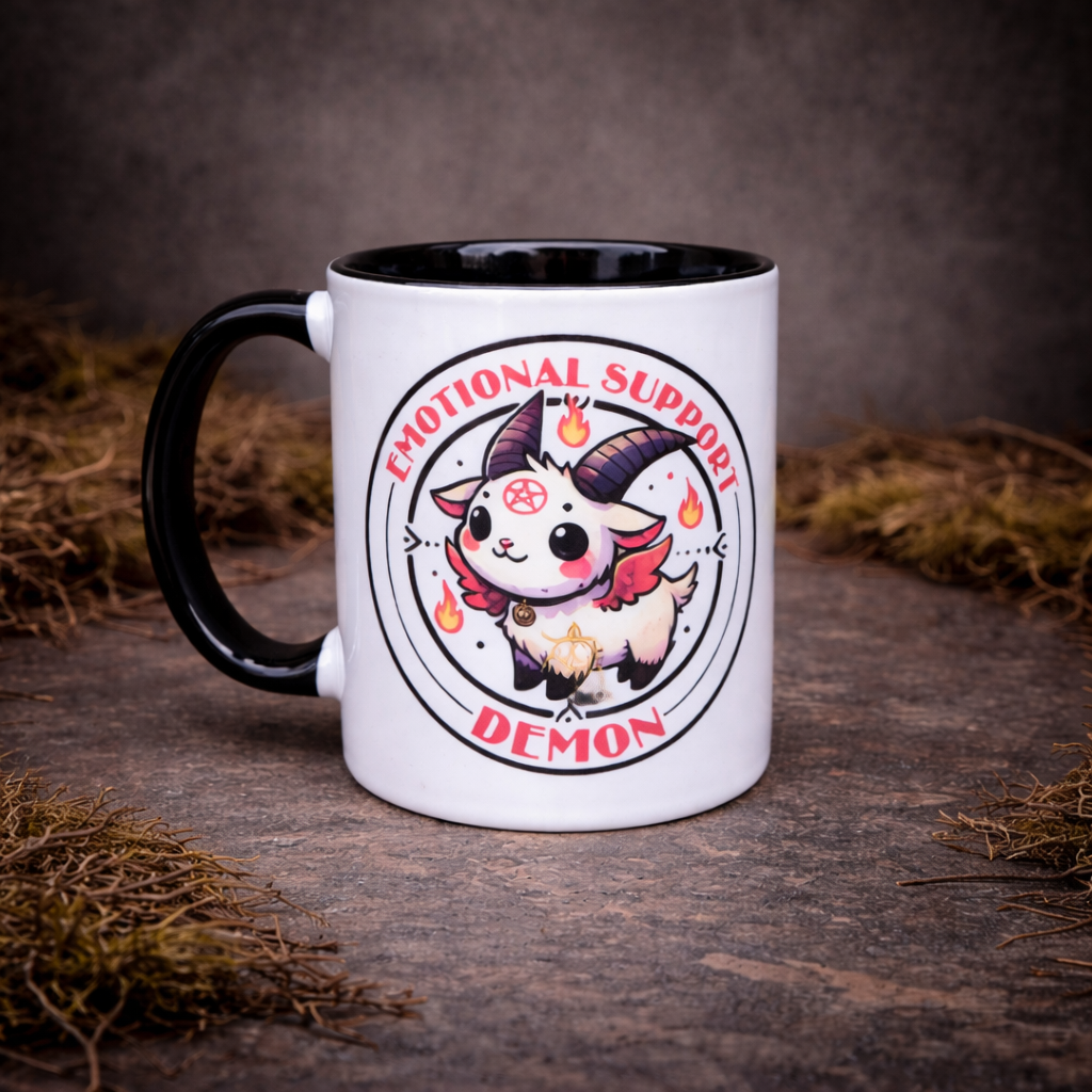 Cute gothic mug with “Emotional Support Demon” design. Kawaii style coffee cup with dark humour twist. Perfect alternative gift idea.