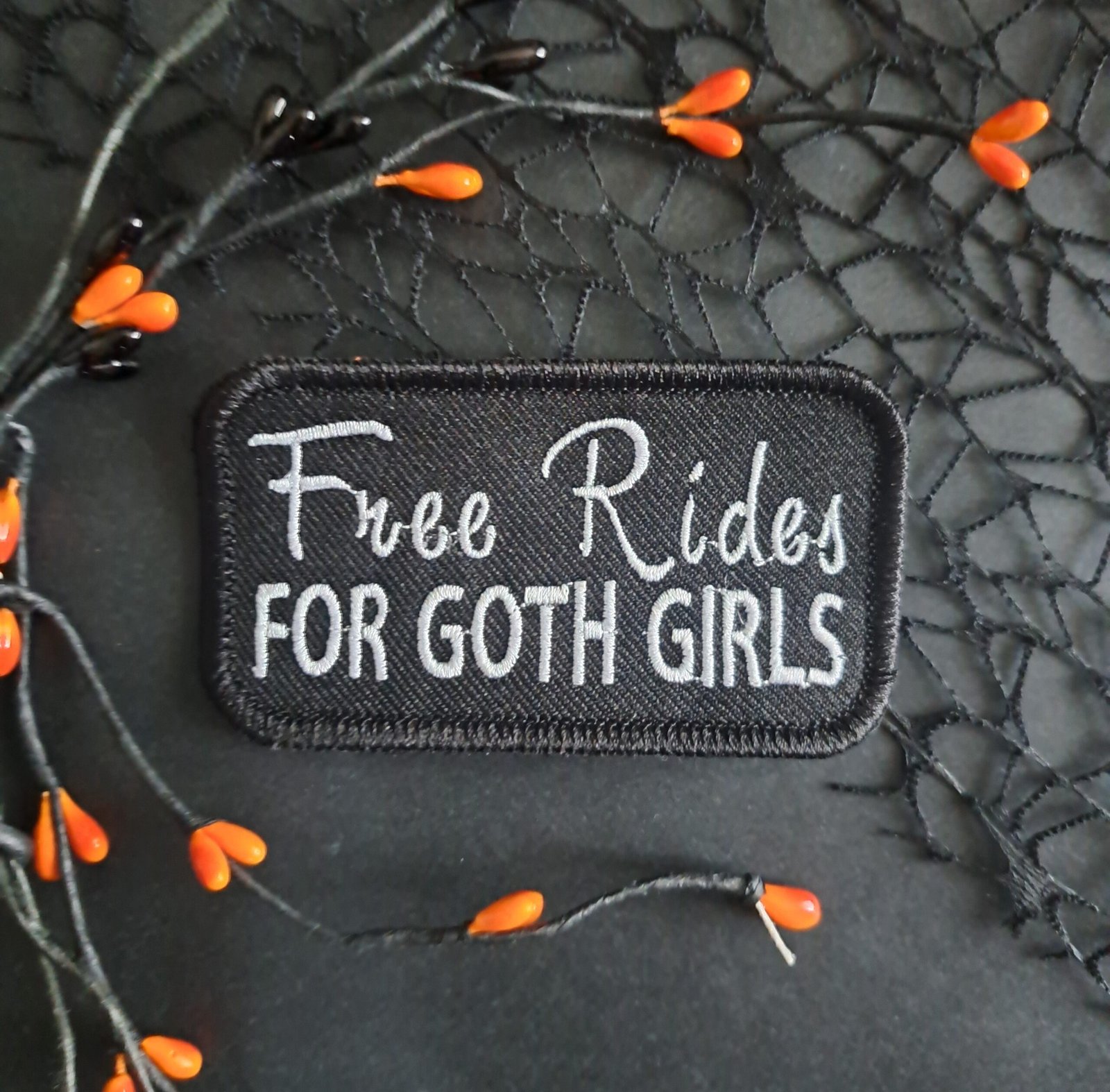 This Free Rides For Goth Girls patch is stitched in grey on black for a clean, moody finish. If you’re looking for a high-quality goth embroidered patch that keeps things dark without being over the top, this one fits the bill.