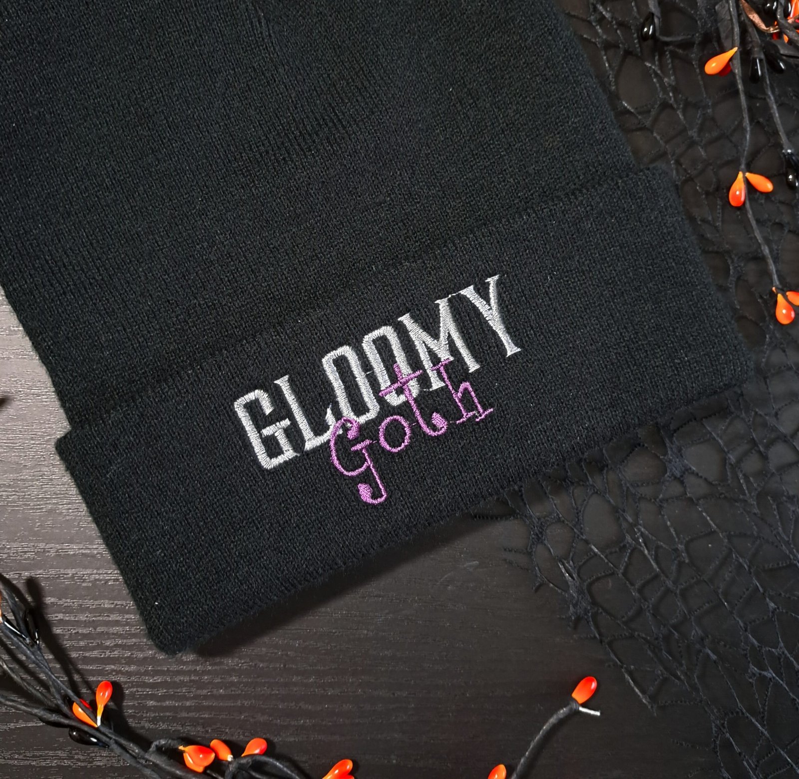 This Gloomy Goth embroidered beanie keeps things simple with sharp white lettering and subtle purple detail stitched directly onto the folded cuff. The contrast thread gives definition without overpowering the design, making it easy to style with everyday alternative pieces.