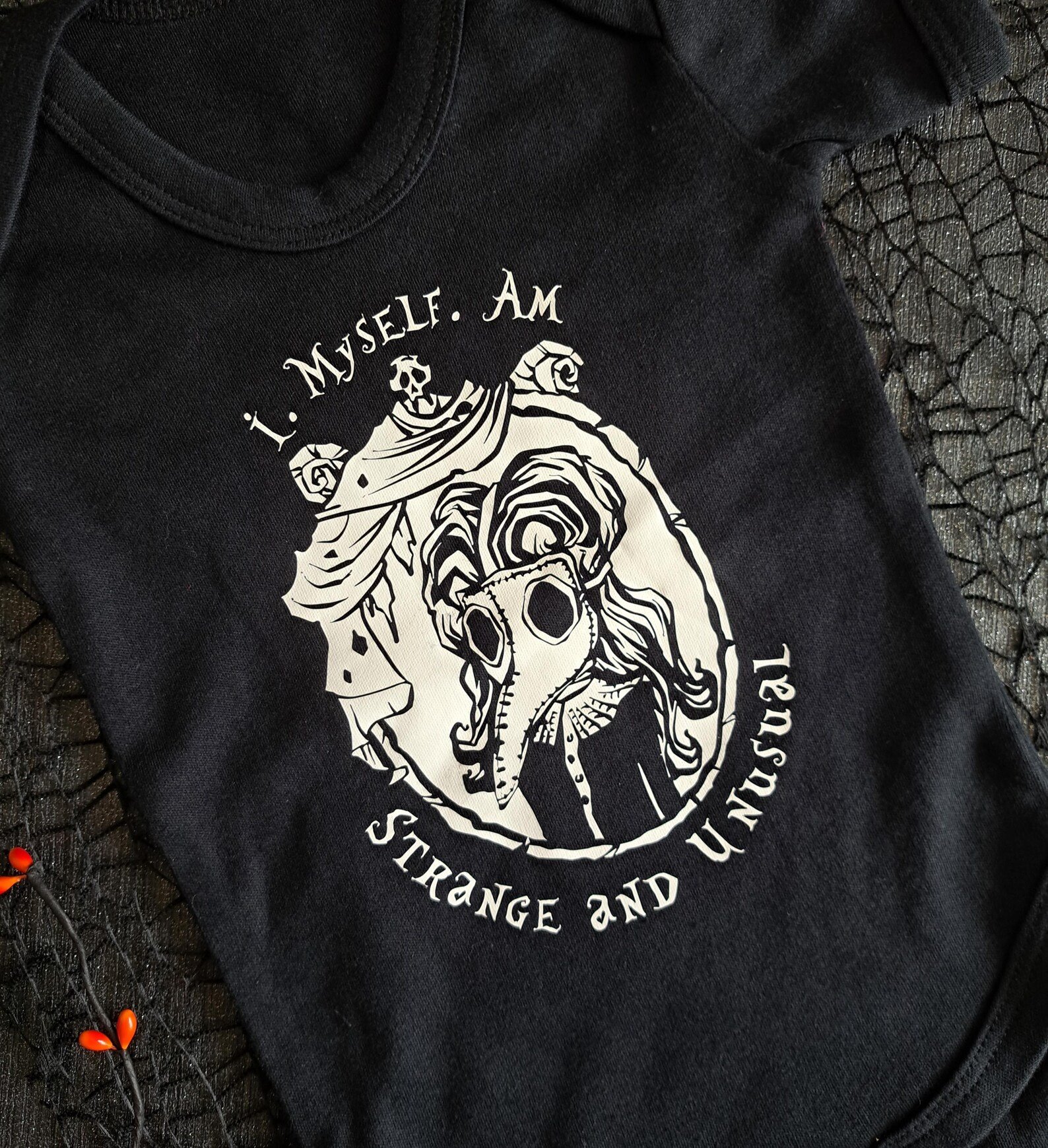 This gothic baby vest features our beautifully detailed plague doctor design with the phrase I, Myself, Am Strange and Unusual — perfect for tiny spooky souls with big personality. It’s a cute goth baby vest that blends eerie charm with soft comfort, making it ideal for everyday wear or as a standout Halloween baby outfit.