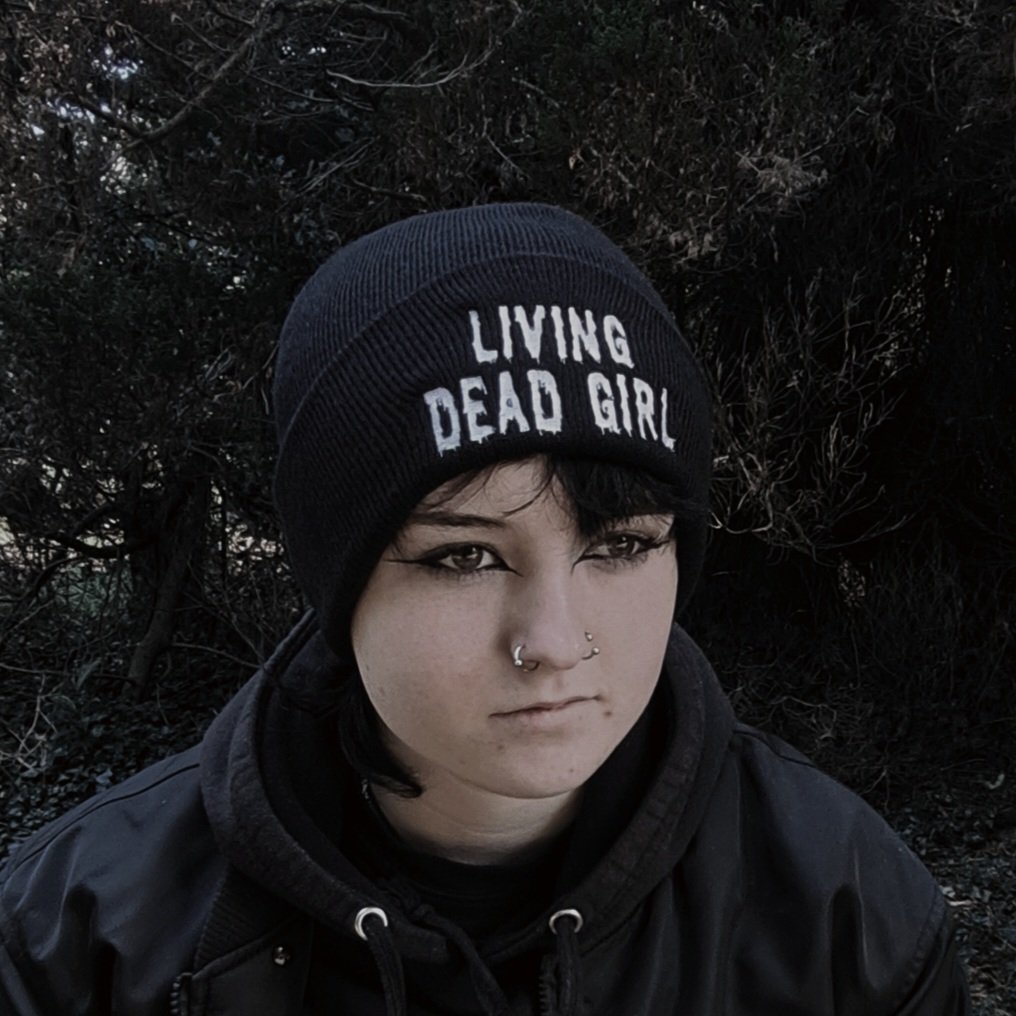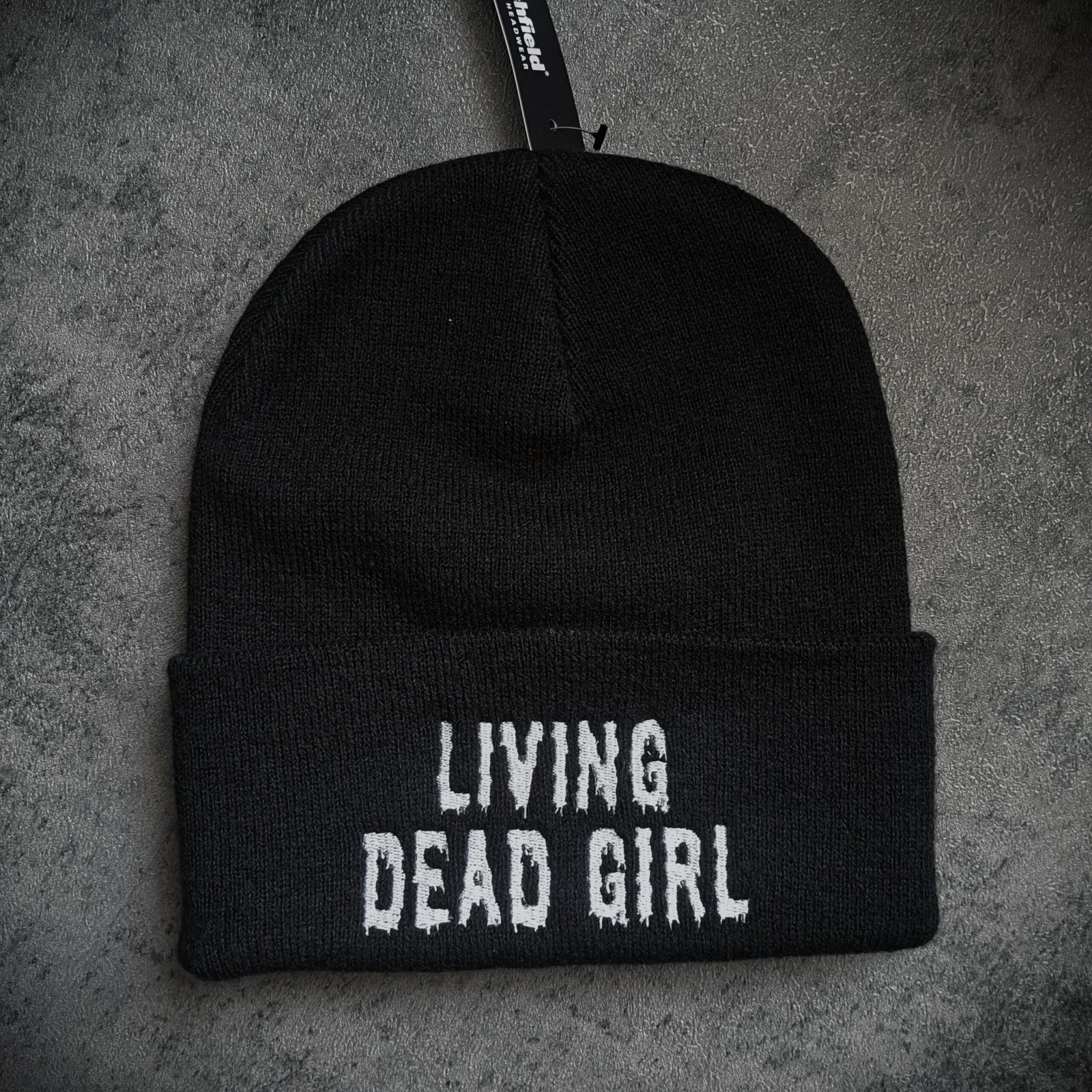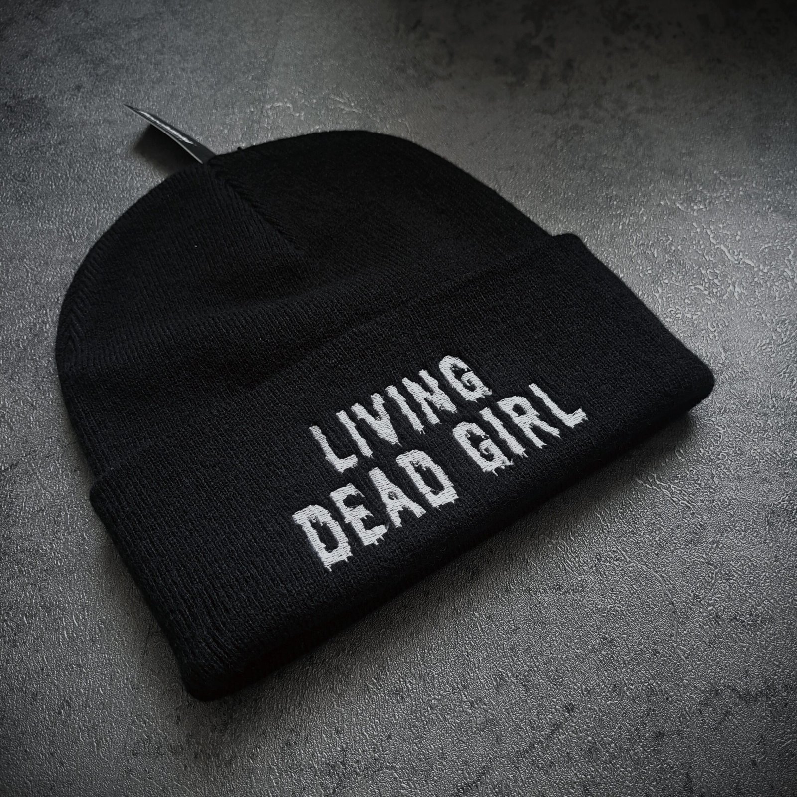Black embroidered gothic beanie hat featuring “Living Dead Girl” design. Warm, durable and perfect for everyday alternative wear.