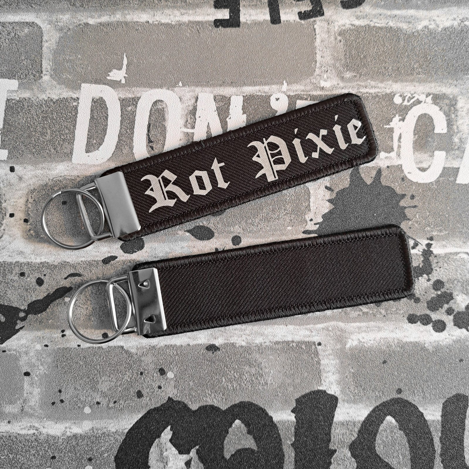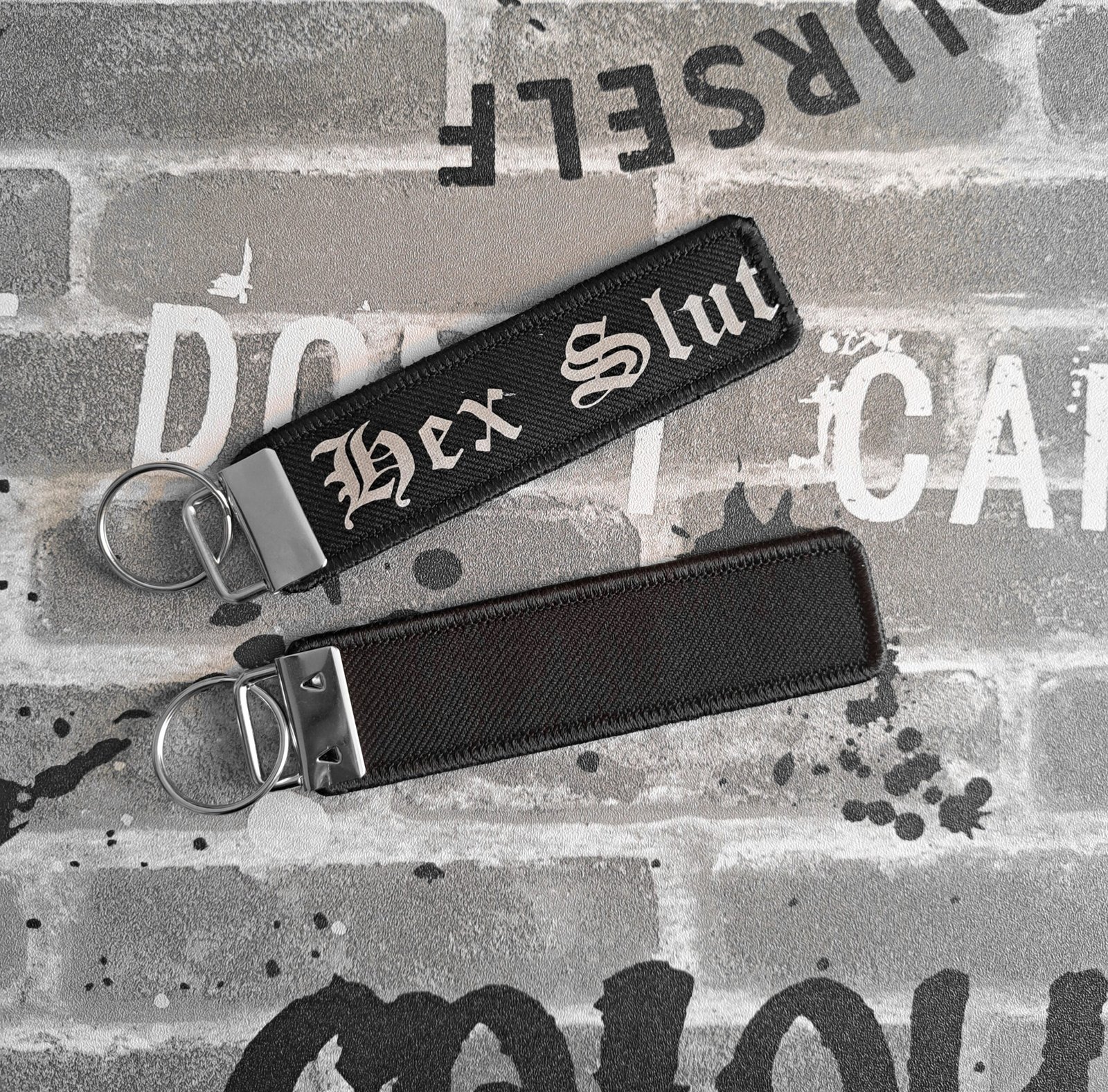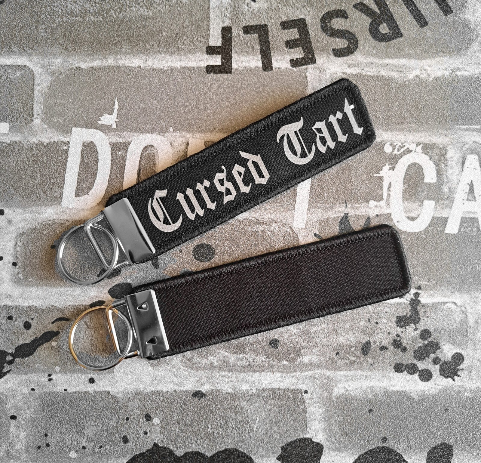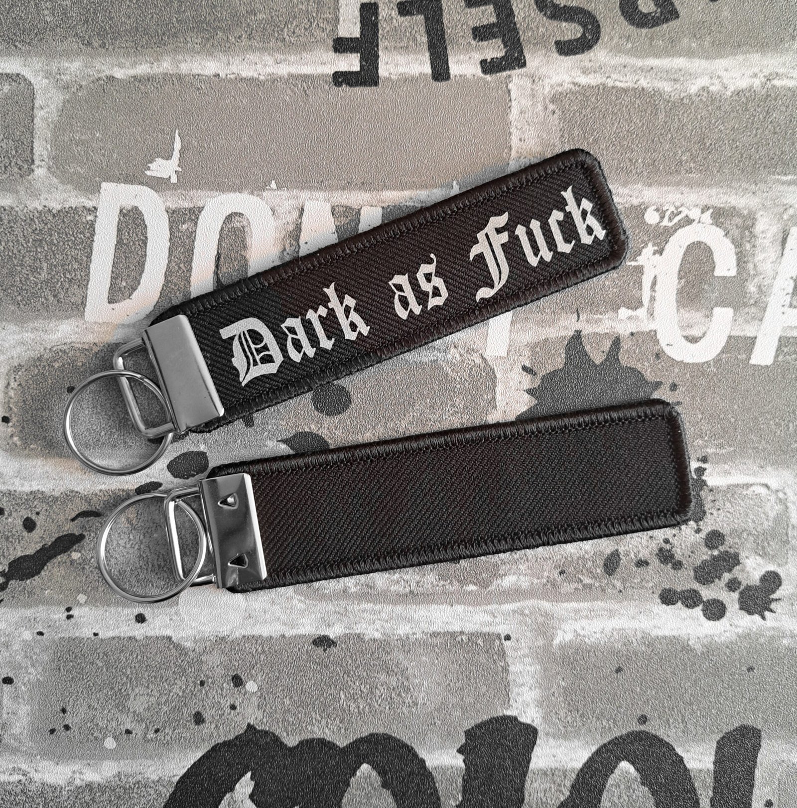 Each keyring features a bold slogan in classic gothic lettering printed on black fabric, creating a simple but striking accessory that fits perfectly with goth fashion, alternative aesthetics and dark humour.