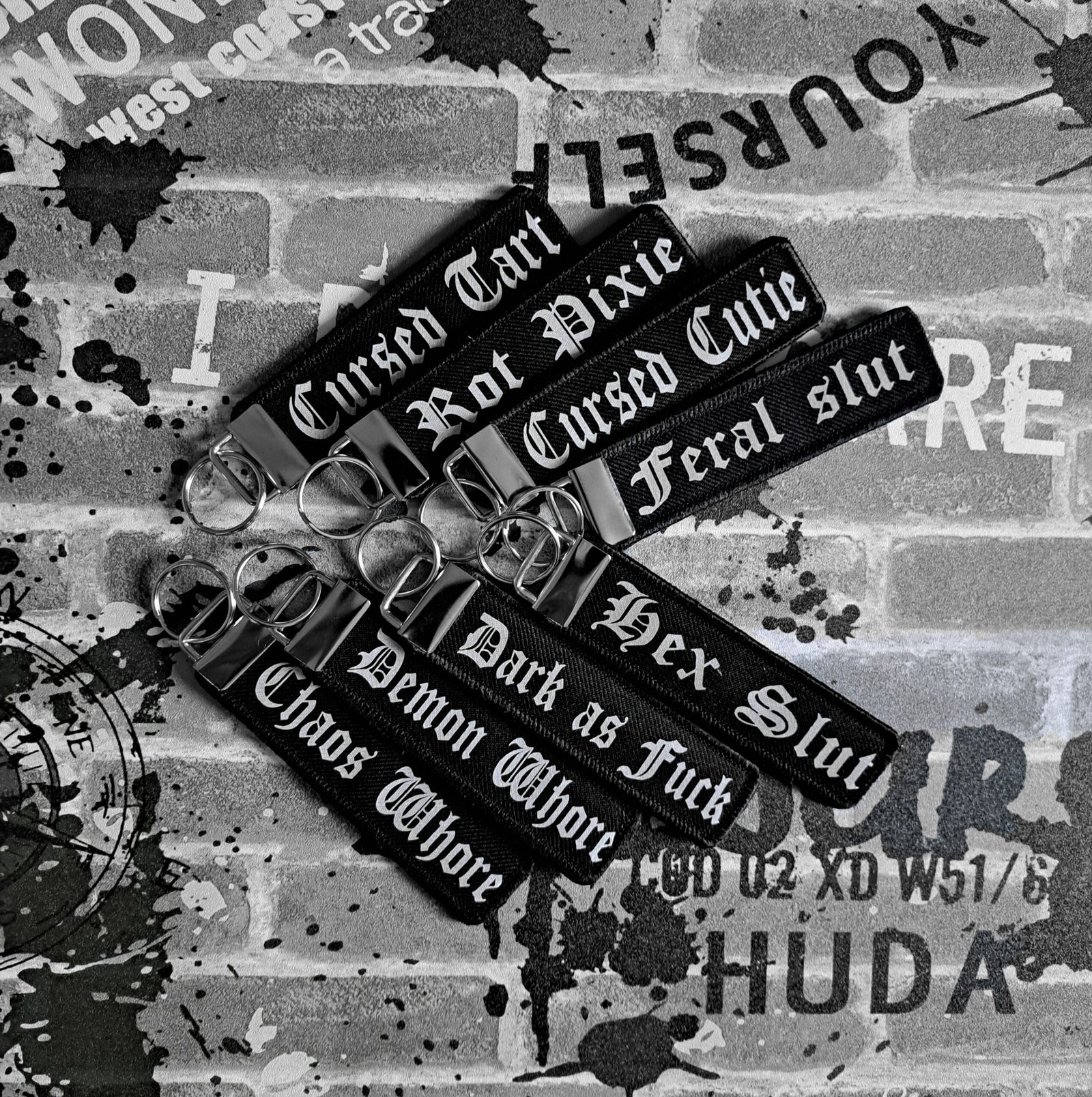 Cursed Cutie Gothic Keyring, Rot Pixie Gothic Keyring, Cursed Tart Gothic Keyring, Hex Slut Gothic Keyring, Feral Slut Gothic Keyring, Demon Whore Gothic Keyring, Chaos Whore Gothic Keyring, Dark As Fuck Gothic Keyring