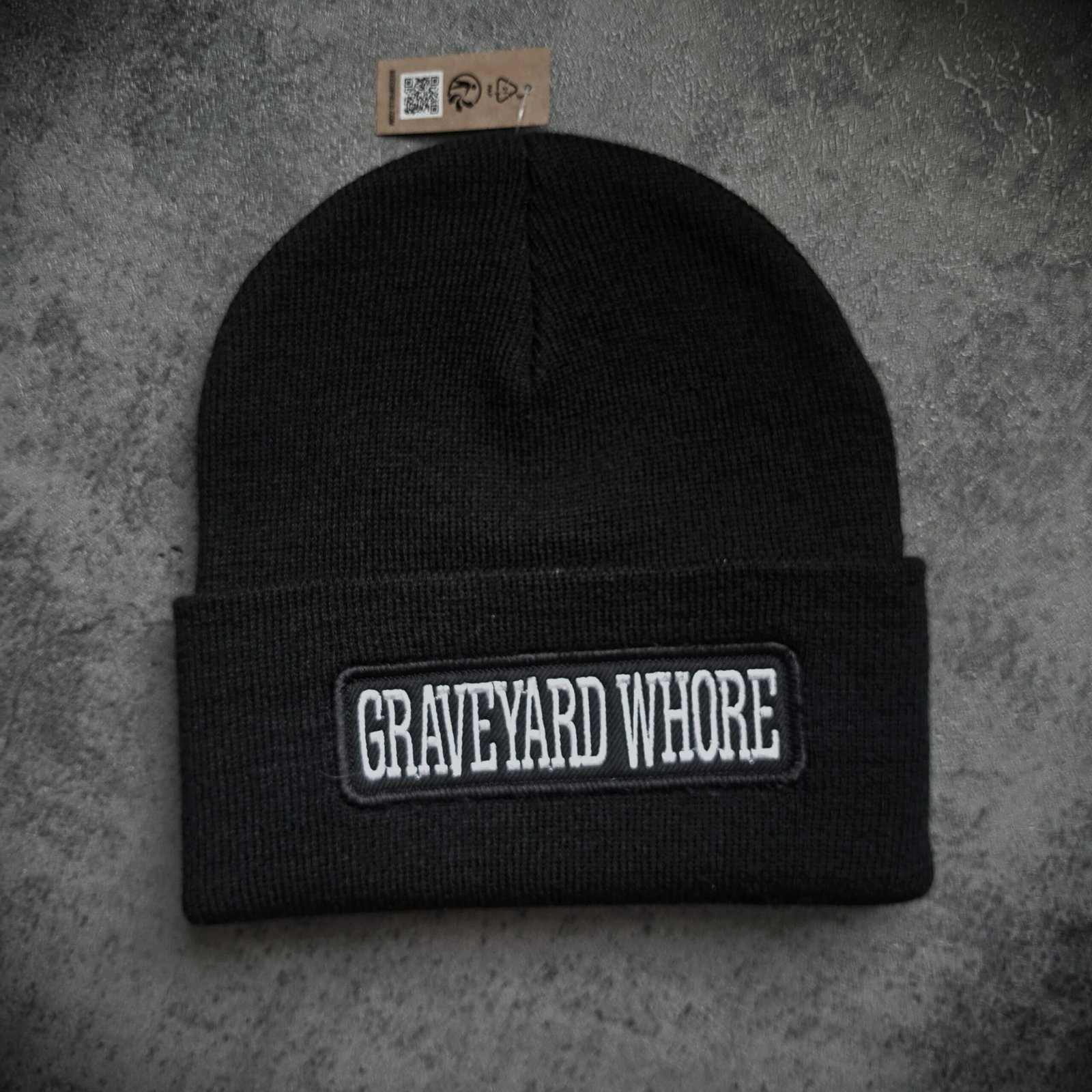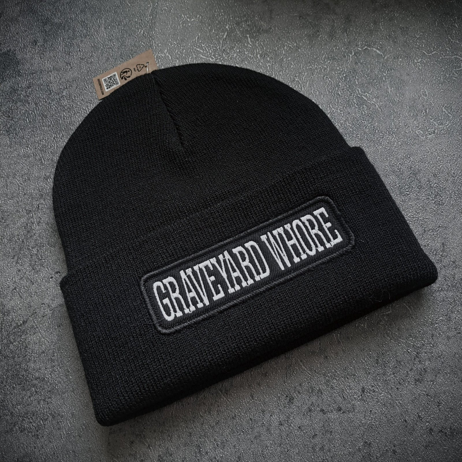 This Graveyard Whore gothic beanie is designed for those who prefer their winter layers dark and unapologetic.