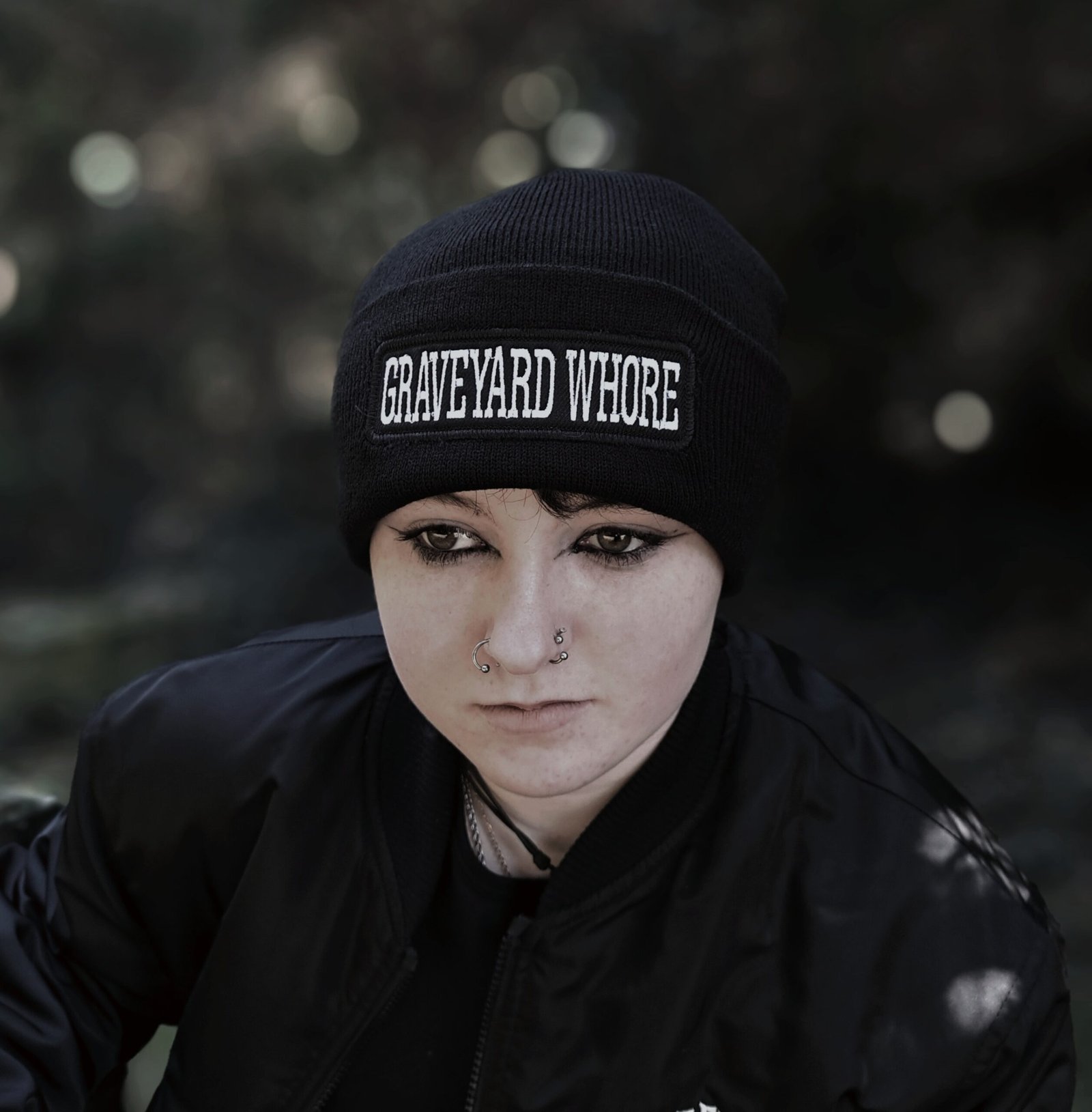 Black cuffed gothic beanie with “Graveyard Whore” embroidered directly onto the front. Soft, warm and designed for alternative wardrobes.