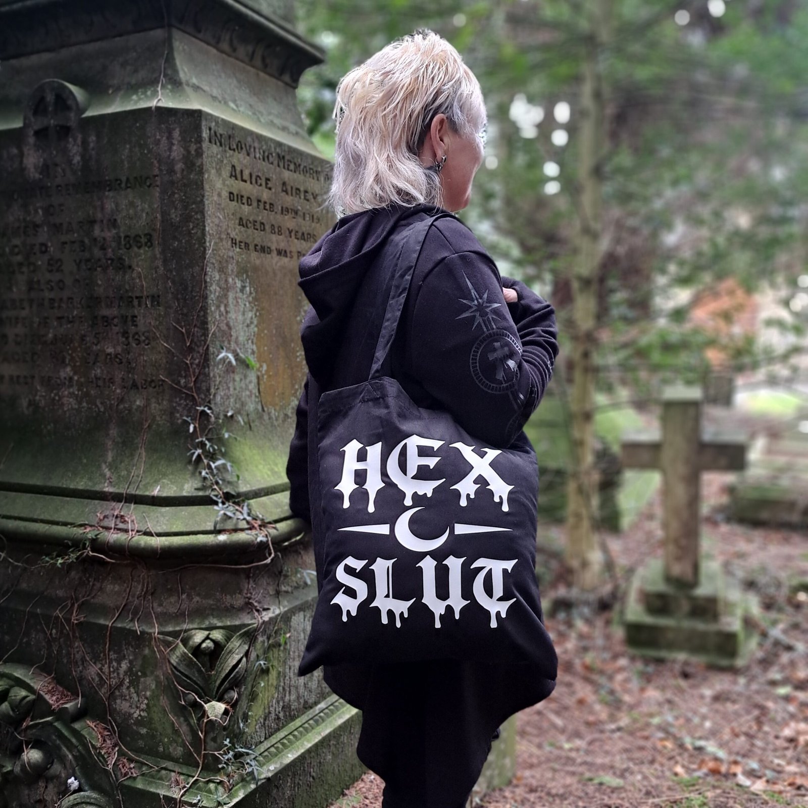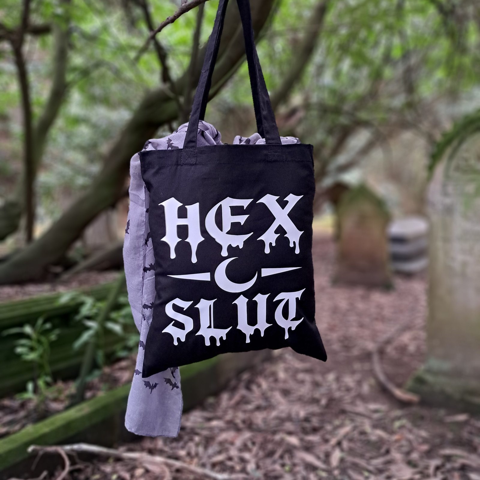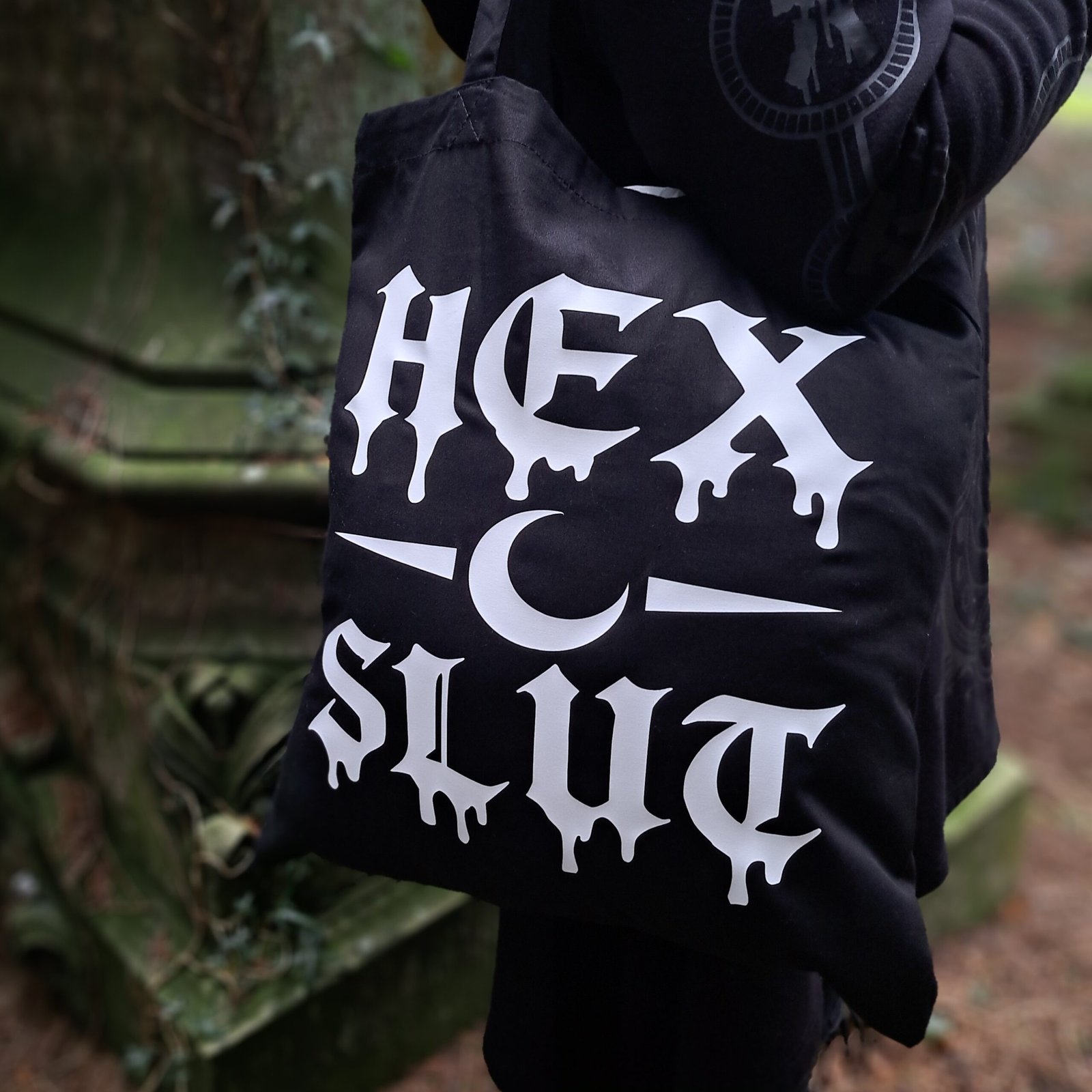 This goth tote bag features bold Hex Slut gothic lettering with a crescent moon symbol, printed in a dripping gothic typeface that captures a dark humour aesthetic.