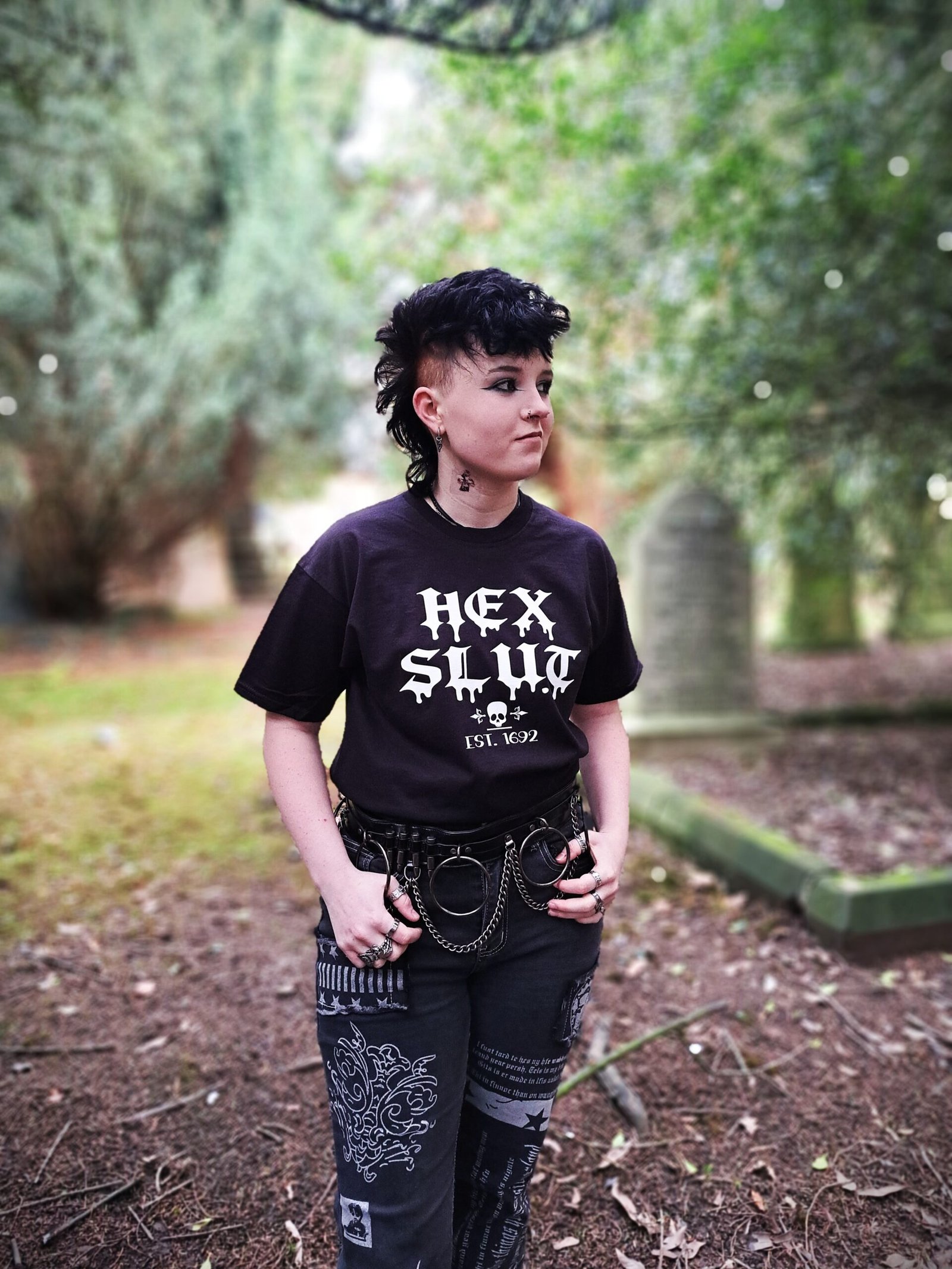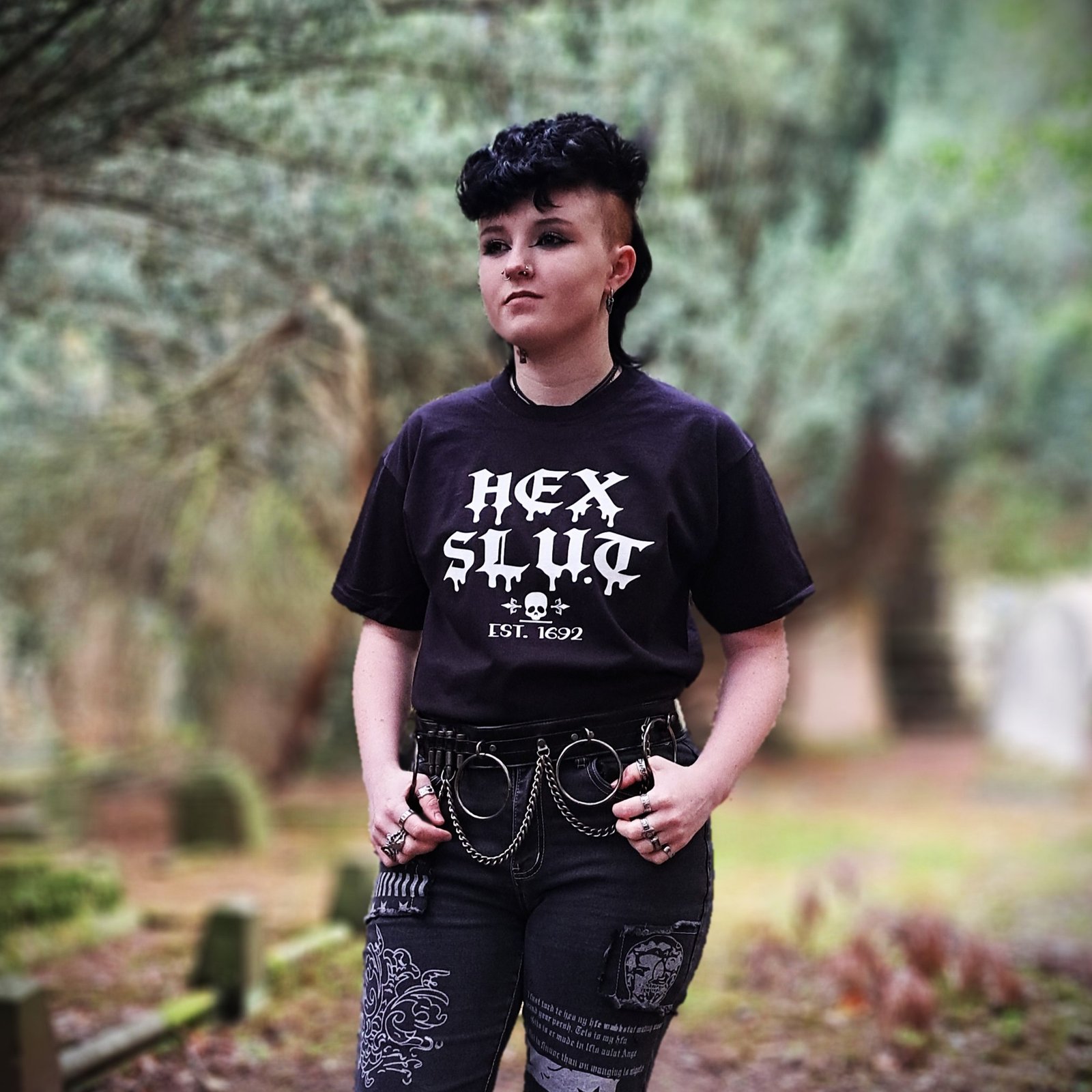 Dark humour meets gothic attitude with the Hex Slut t-shirt, a bold alternative fashion piece designed for lovers of witchcraft aesthetics, gothic style and unapologetic sarcasm.
