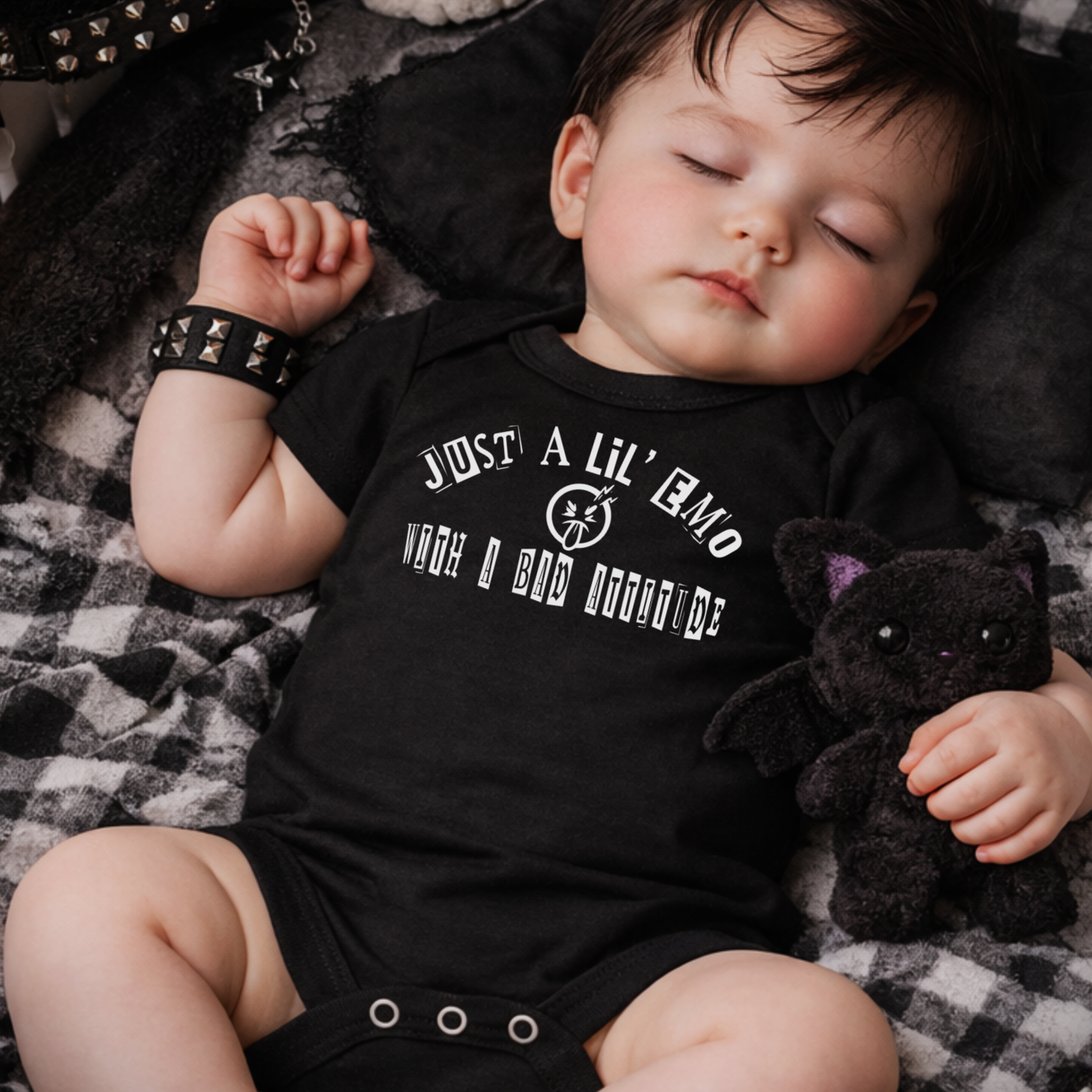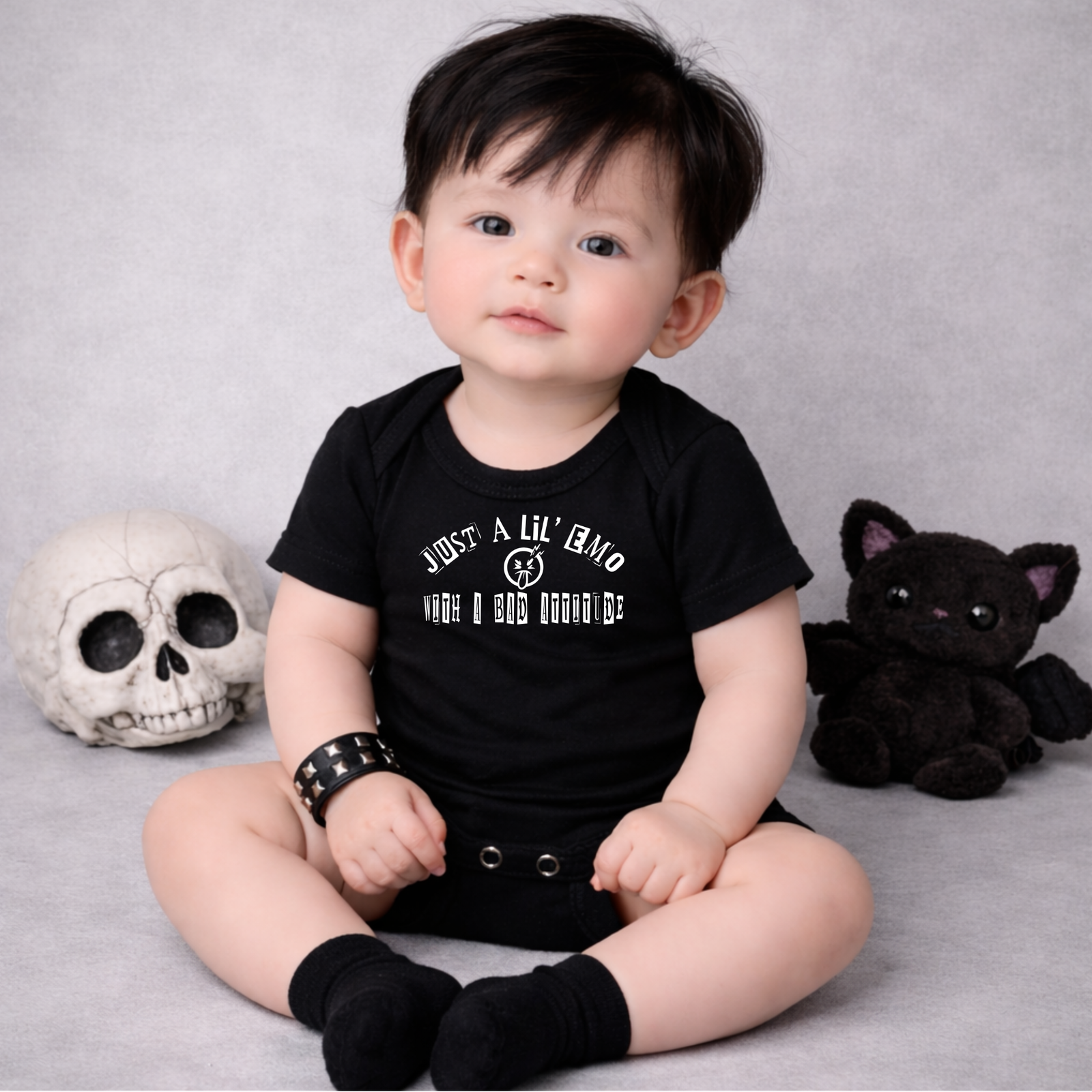 This emo baby grow is perfect for alternative baby clothing, gothic baby outfits, and parents with a sense of humour.