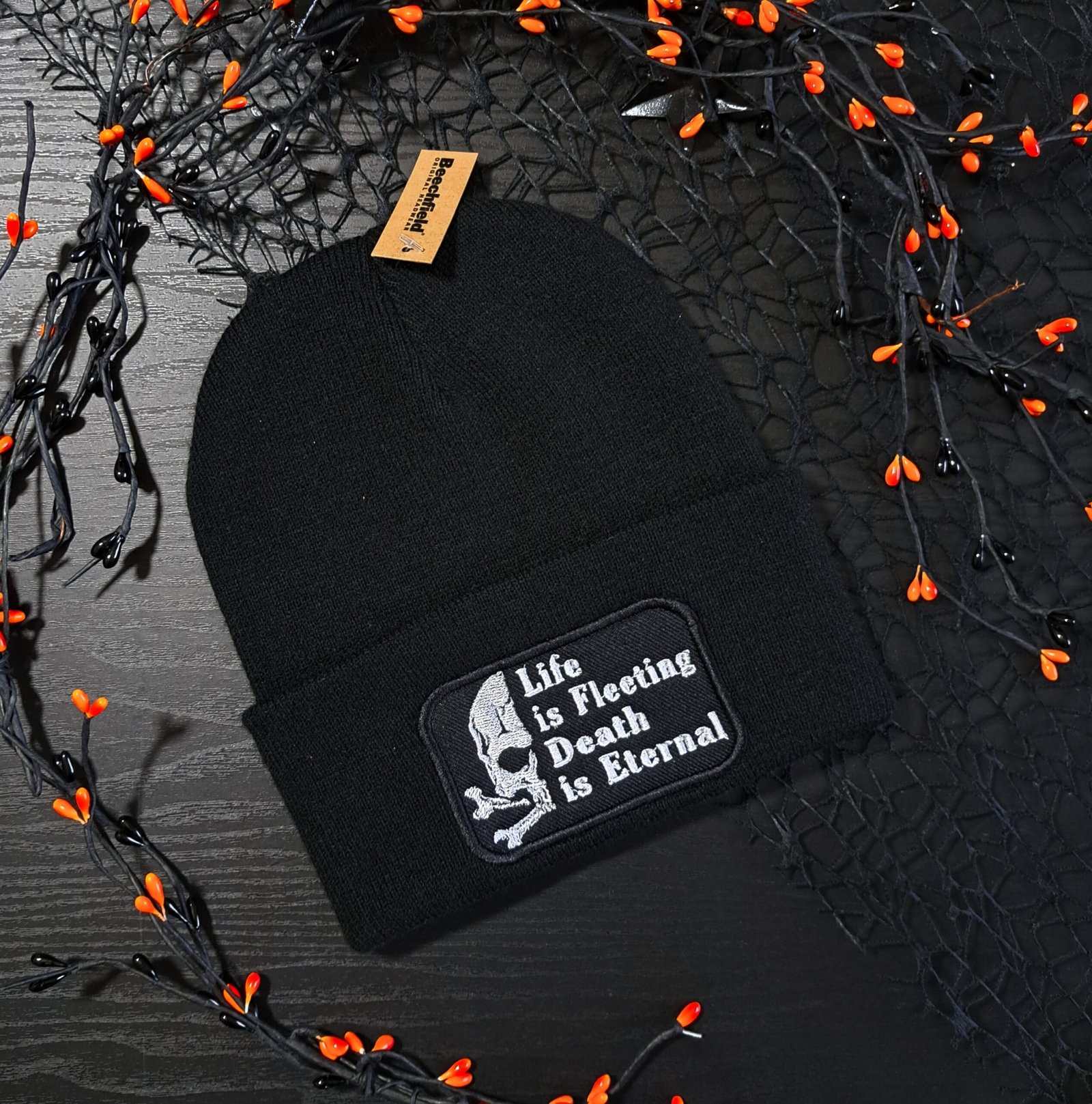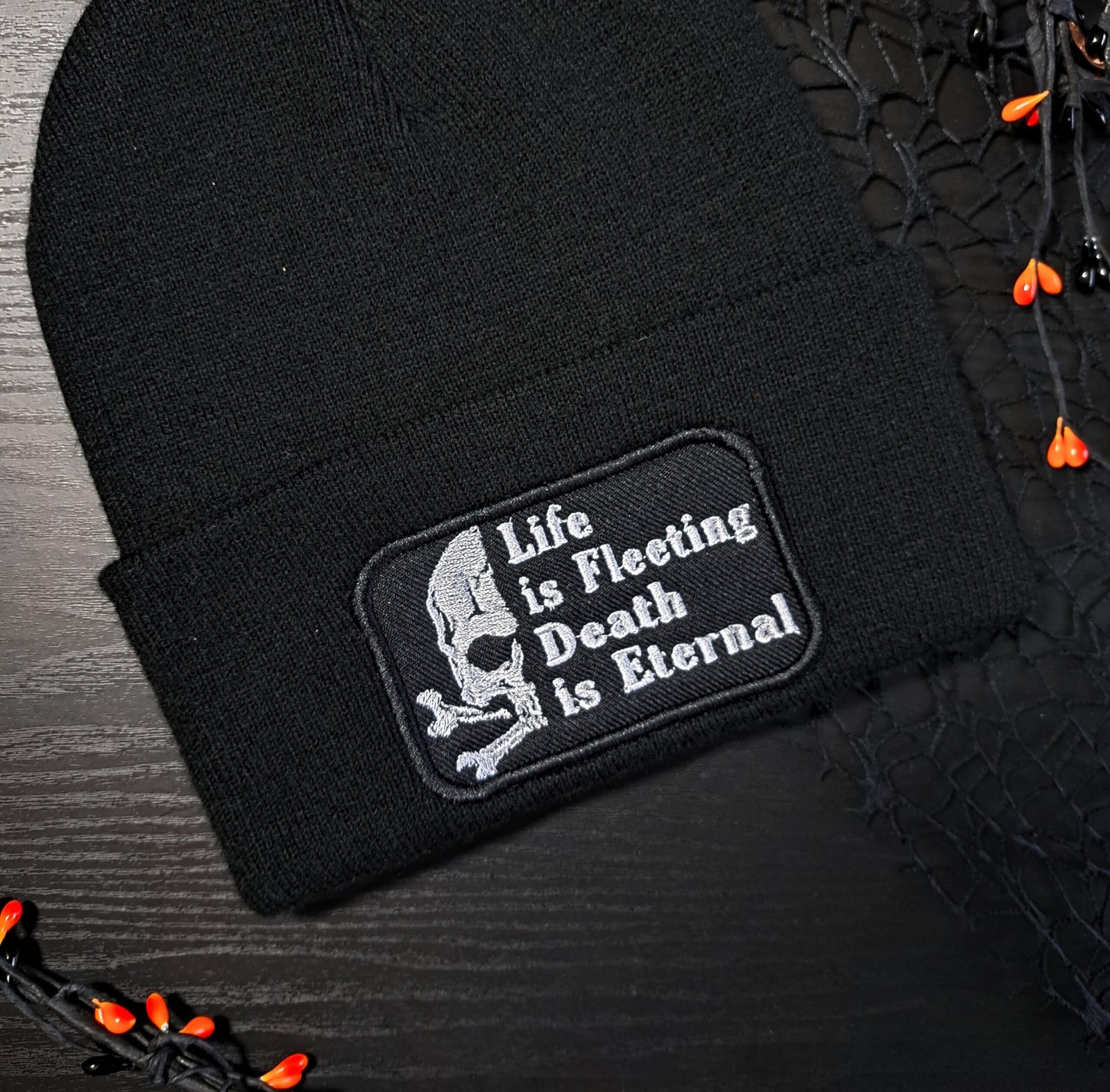 This Life Is Fleeting Death Is Eternal gothic beanie features direct embroidery across the folded cuff, paired with a skull detail for a sharper edge. The design is stitched straight into the knit, giving it a clean, structured finish that won’t peel, lift or add bulk.