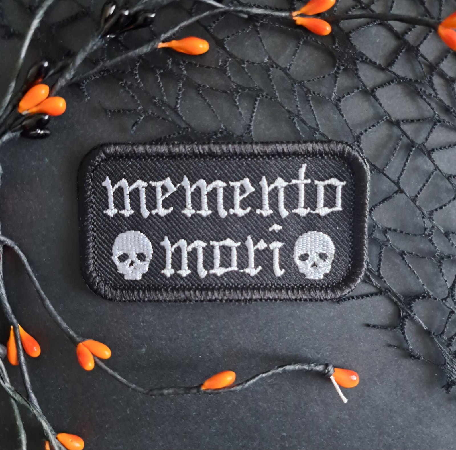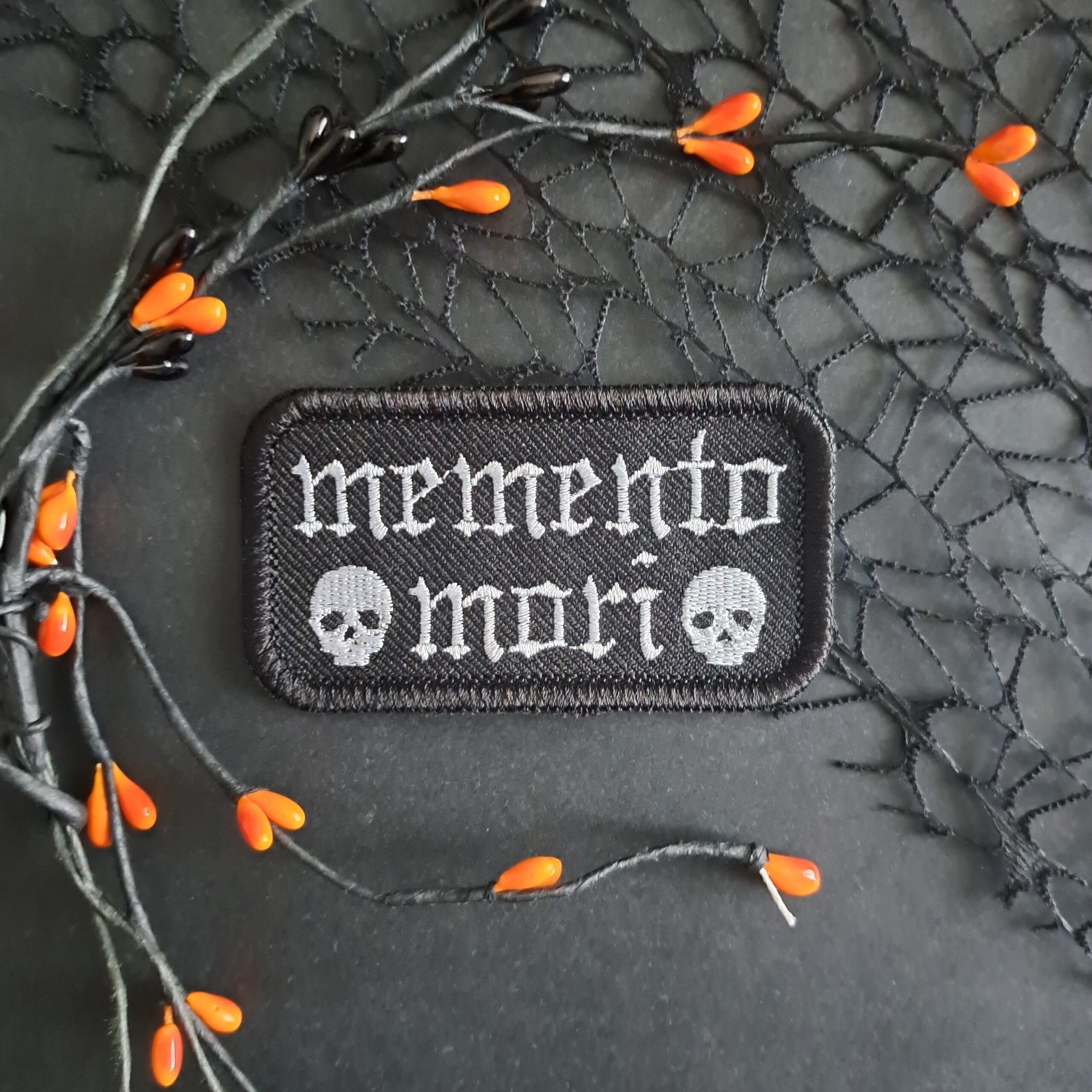 This Memento Mori patch features bold medieval-style lettering stitched in silver thread against a black background, framed by two skull motifs. Clean, sharp and unapologetically dark.