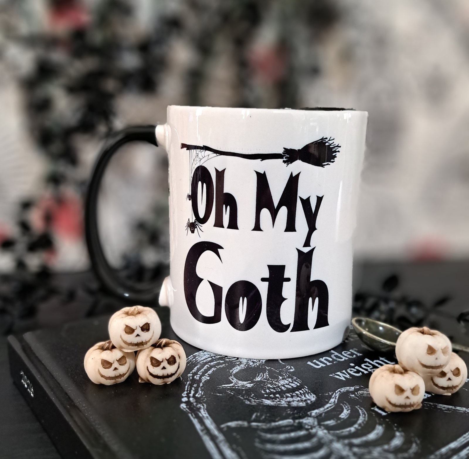 Oh My Goth ” black and white gothic coffee mug with broom and spider detail. A funny spooky gift for goths, witches and Halloween lovers.