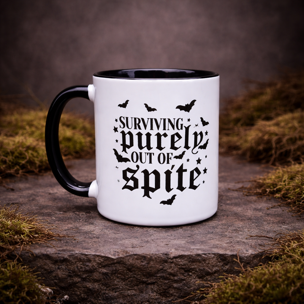 Funny gothic mug featuring “Surviving Purely Out of Spite”. 11oz ceramic coffee cup, perfect for sarcastic humour, gifts or everyday use.