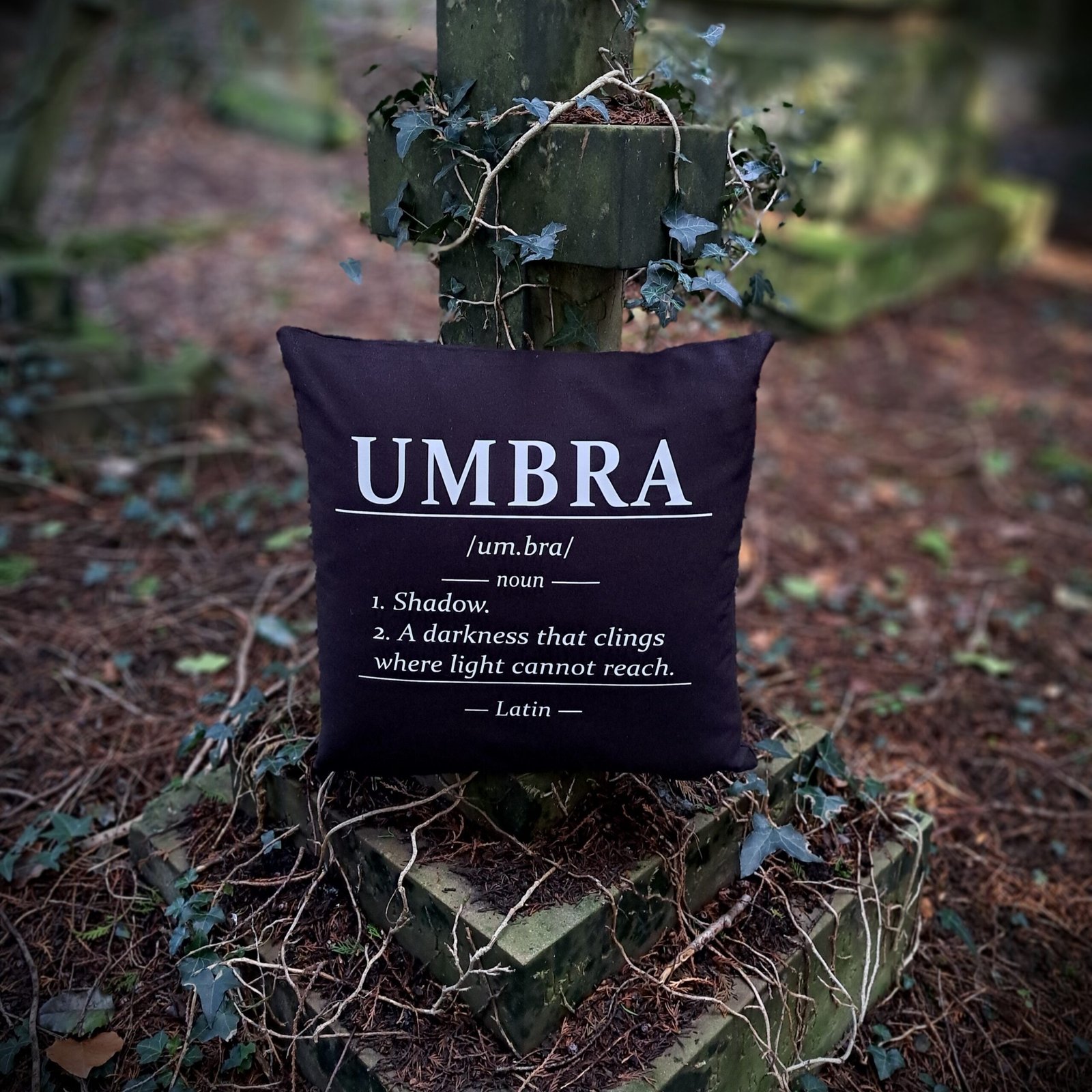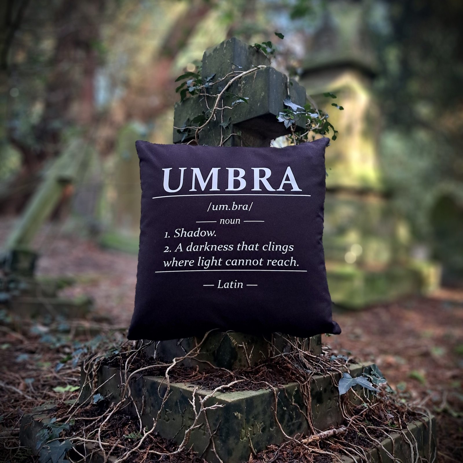 Bring shadow and language together with this striking Umbra gothic cushion cover, inspired by dark Latin typography and gothic aesthetics.