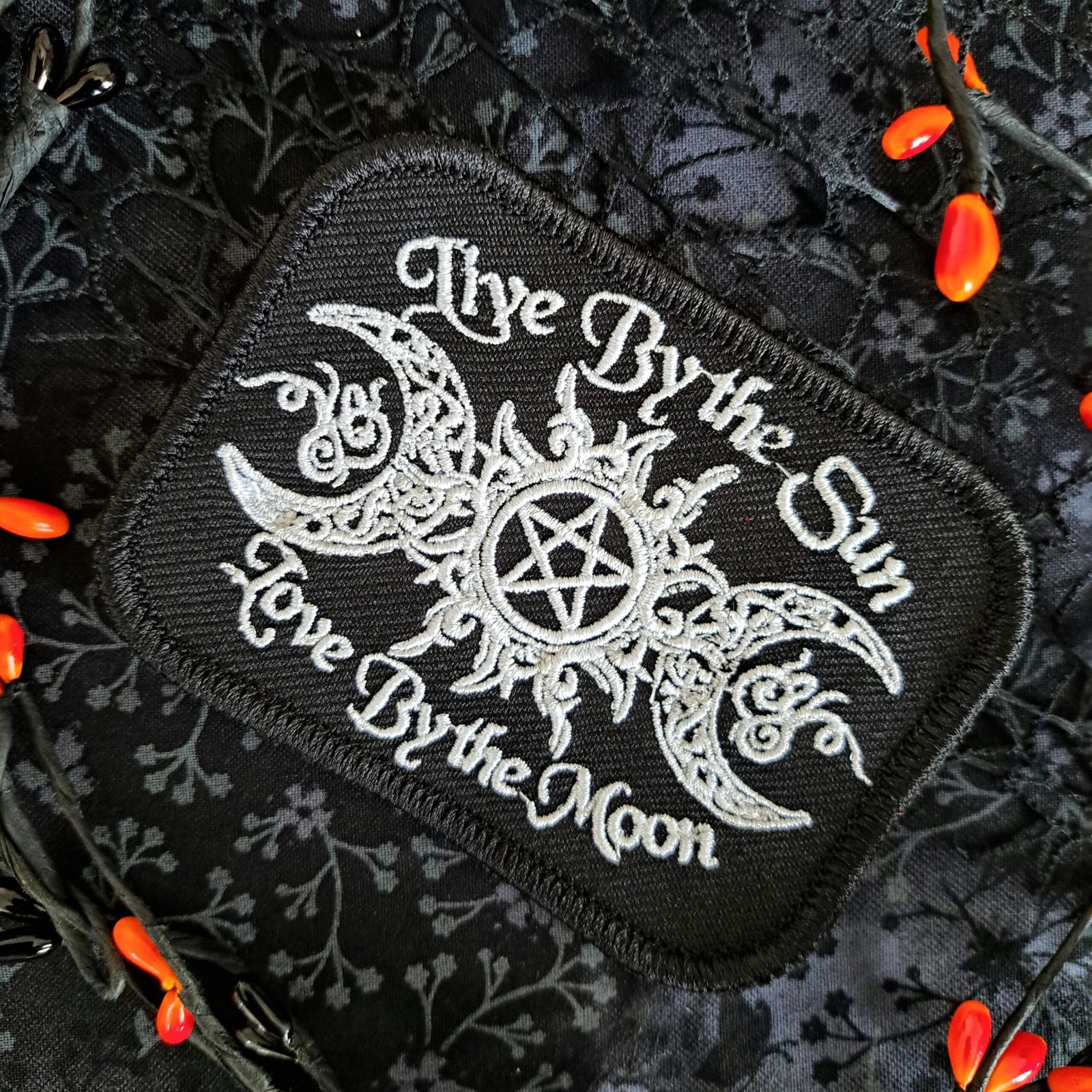 This witchy embroidered patch features the phrase “Live By The Sun, Love By The Moon” stitched in white thread on a deep black background, framed by an intricate triple moon and pentagram design.