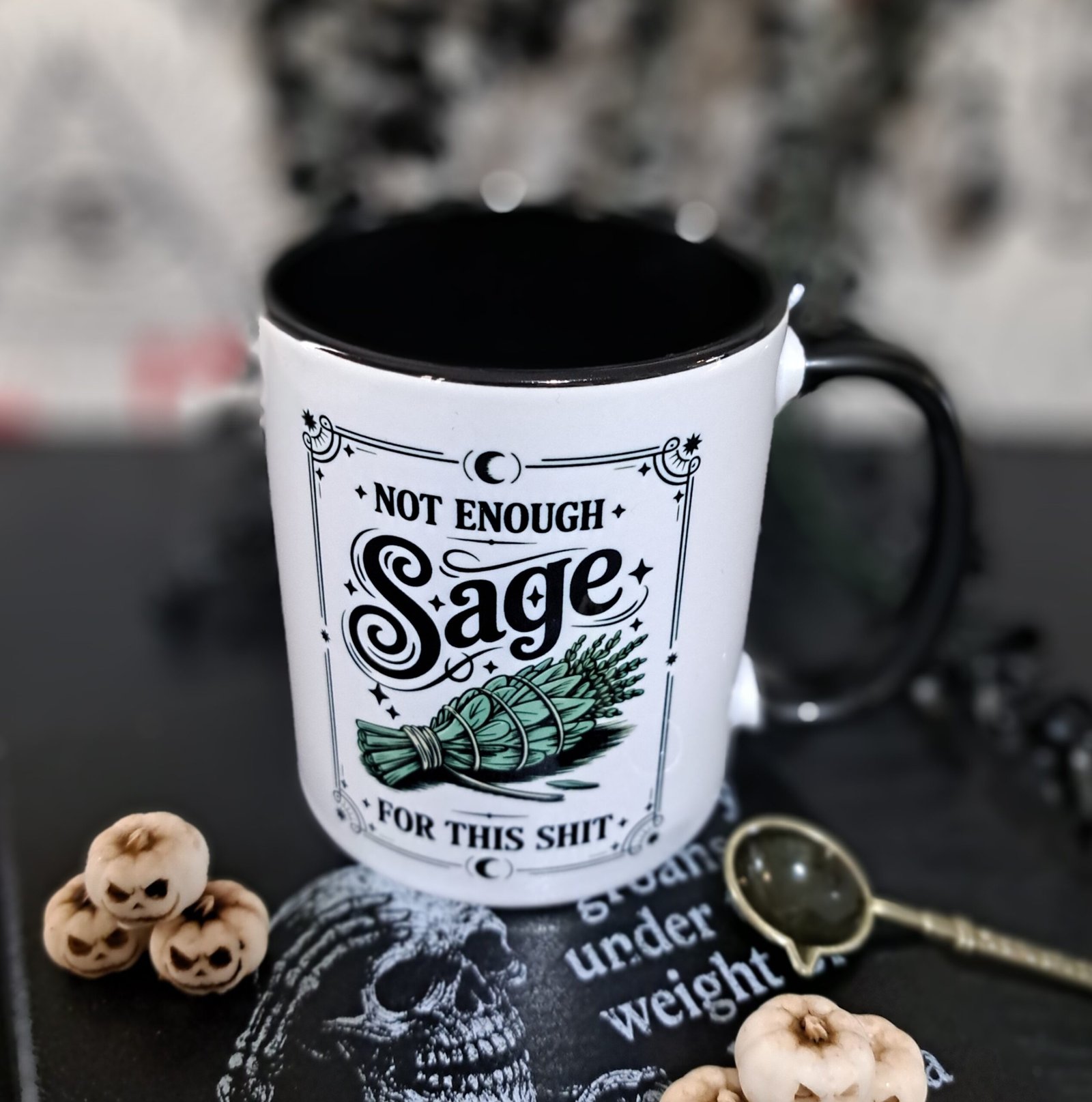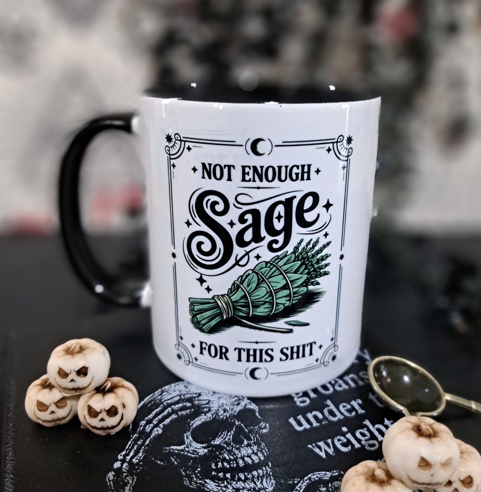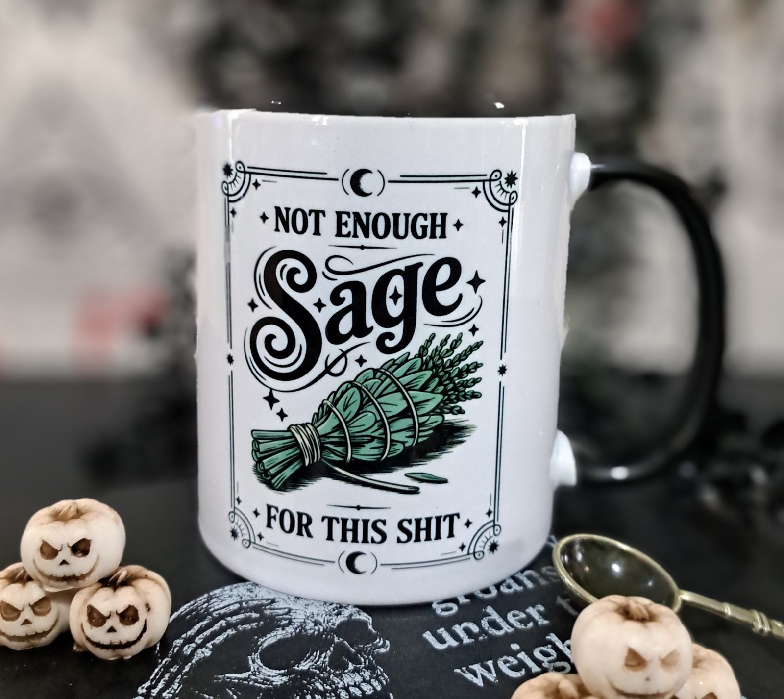 This witchy sarcastic mug blends bold gothic typography with dark humour and a detailed sage bundle illustration. Designed in high-contrast monochrome with a black handle and interior, it delivers a sharp alternative aesthetic that suits gothic homes and witchy kitchens alike.